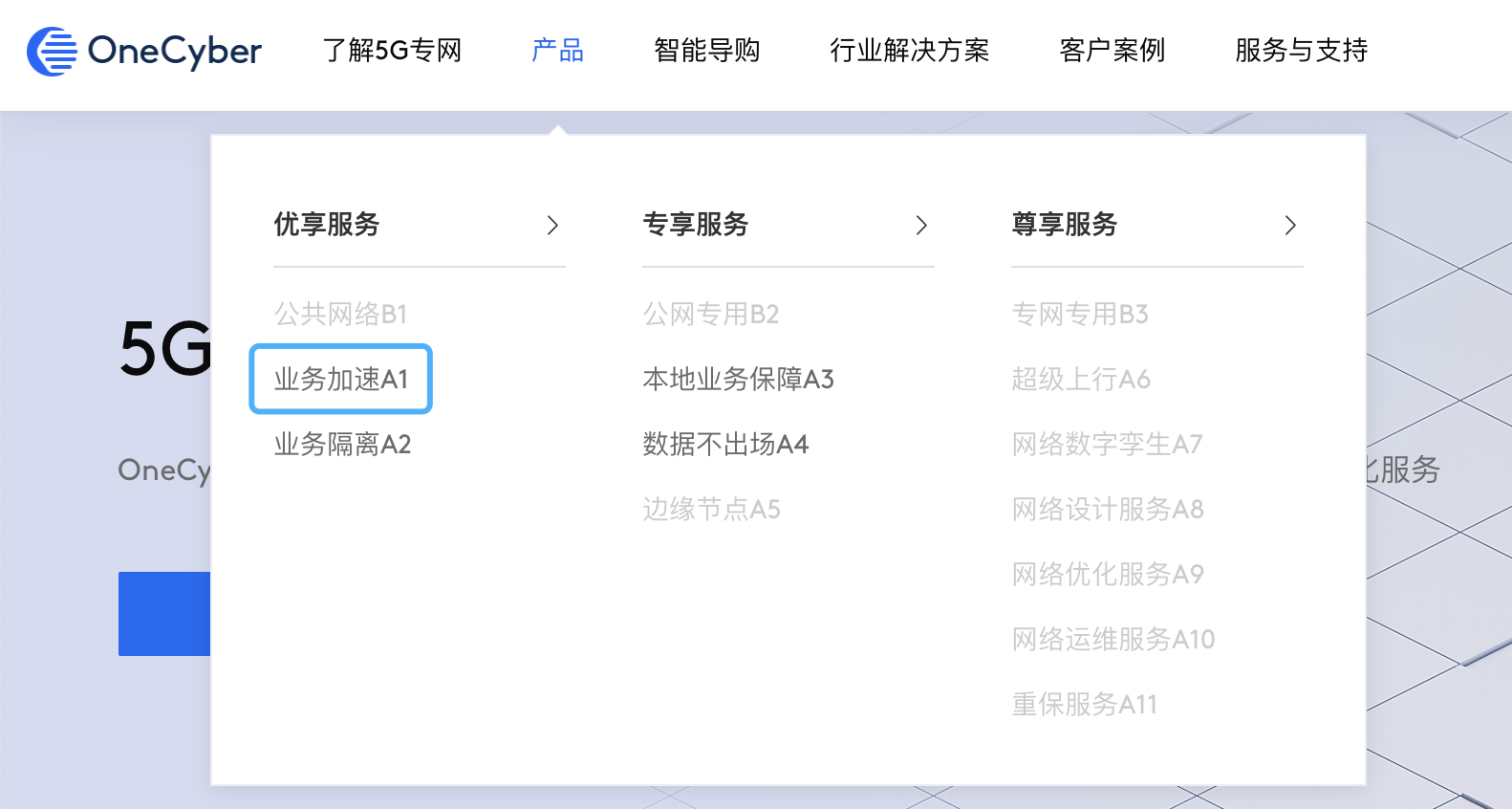 2.在门户顶部导航栏产品选择优享服务目录的业务加速A1。