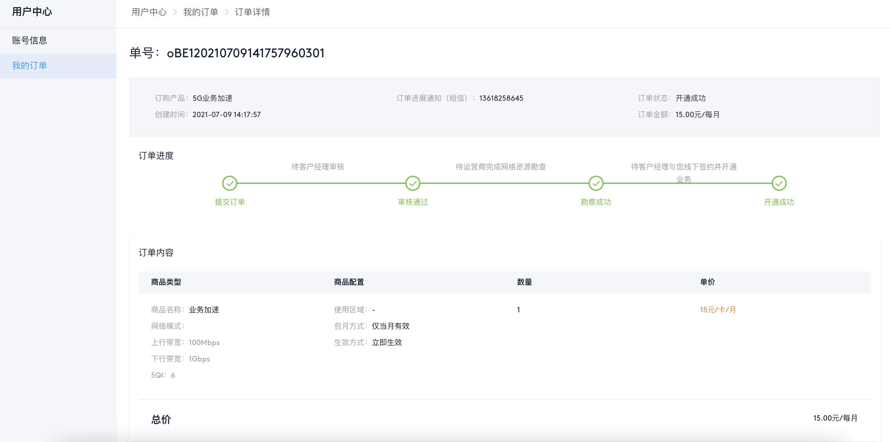 | 提交成功 | 客户在5G专网平台进行订单确认后,即提交成功。相应订单会流转到客户经理处进行审核 |