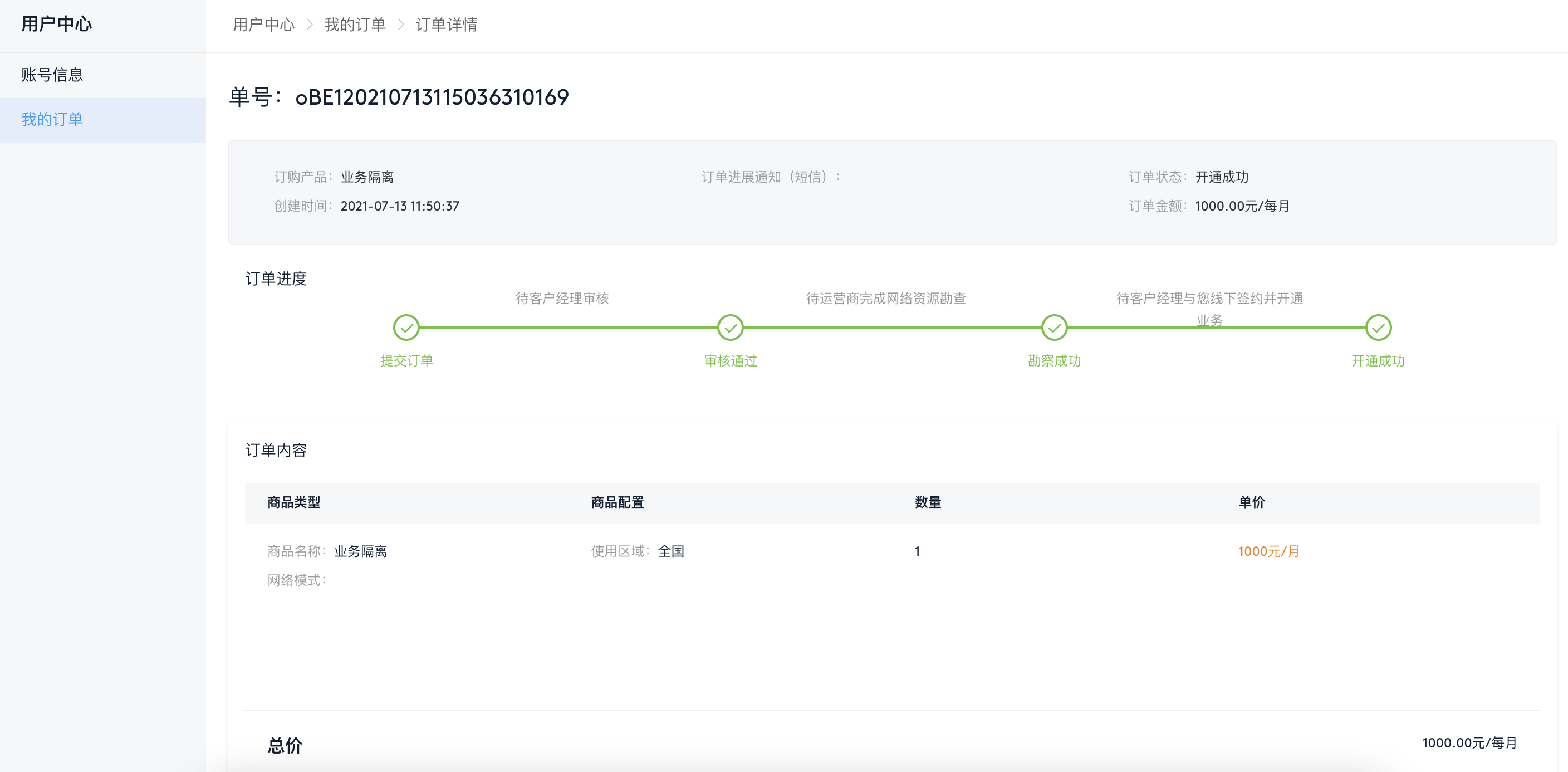 | 提交成功 | 客户在5G专网平台进行订单确认后,即提交成功。相应订单会流转到客户经理处进行审核 |