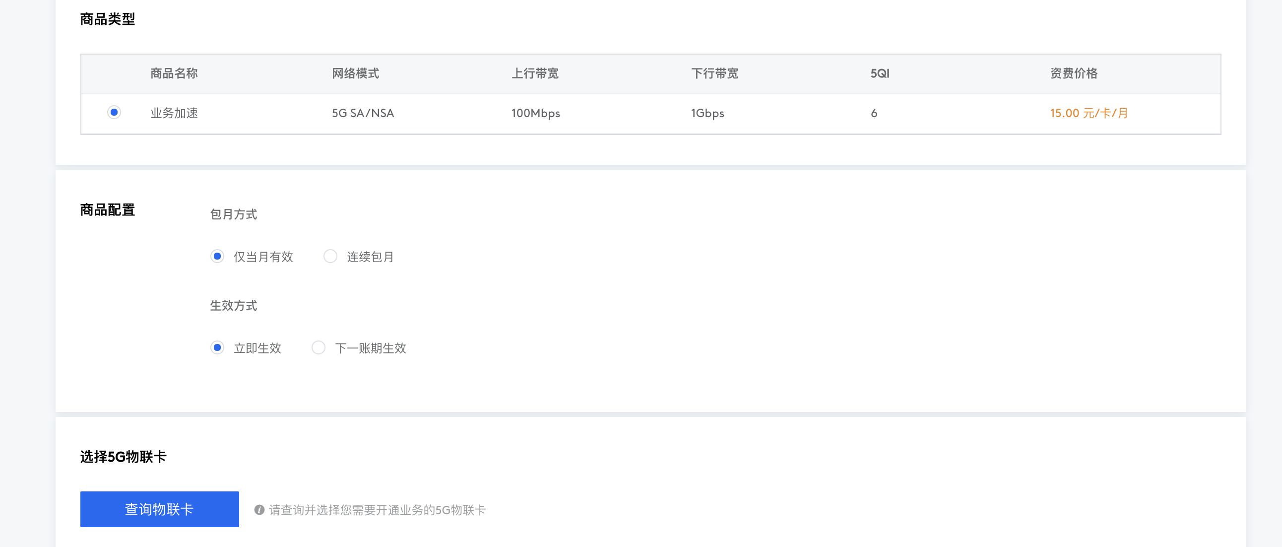 | 业务加速A1 | 将畅联服务升级为极速服务,设置5QI=6、上行/下行峰值速率=100Mbps/1Gbps | 15 |