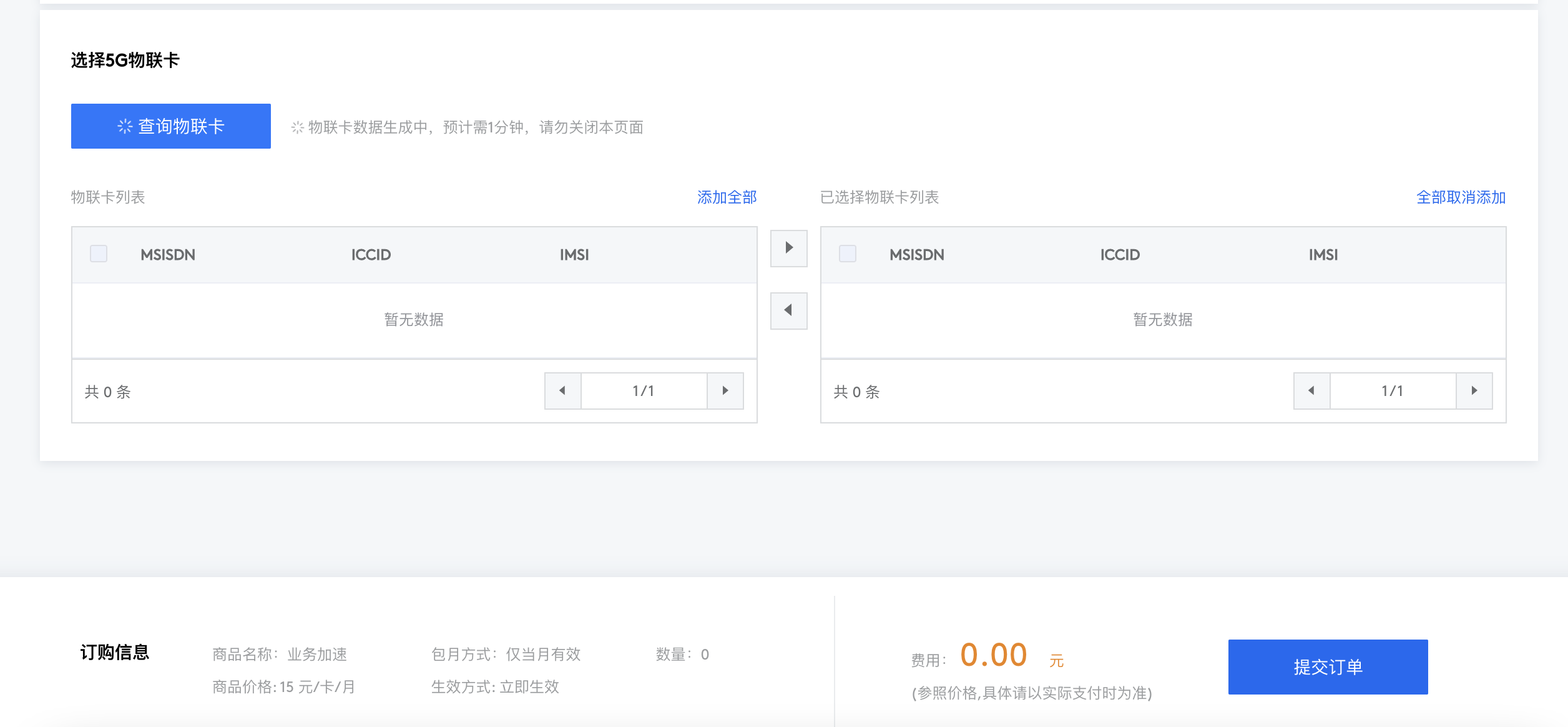 6.在穿梭框中勾选物联卡,点击添加按钮,确定选择的物联卡,可查看到已选卡张数和总价格。
