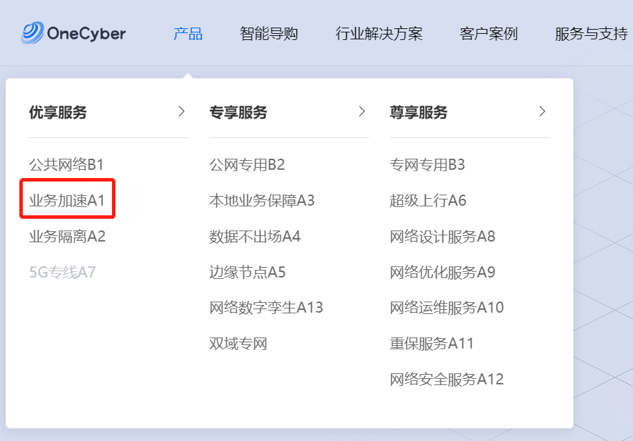2.在门户顶部导航栏产品选择优享服务目录的业务加速A1。