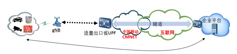 说明:通过租用移动公司或其他运营商互联网专线,终端通过NAT方式,在UPF处获取公网地址后访问互联网,此模式一般是为配合PCC策略业务订购使用,即:通过黑白名单访问、分应用控制、关停调速,允许或限制终端上行访问协议、域名、网址、端口等,实现数据安全和优惠计费;此模式下,终端不能指定终端地址池、不能绑定静态IP