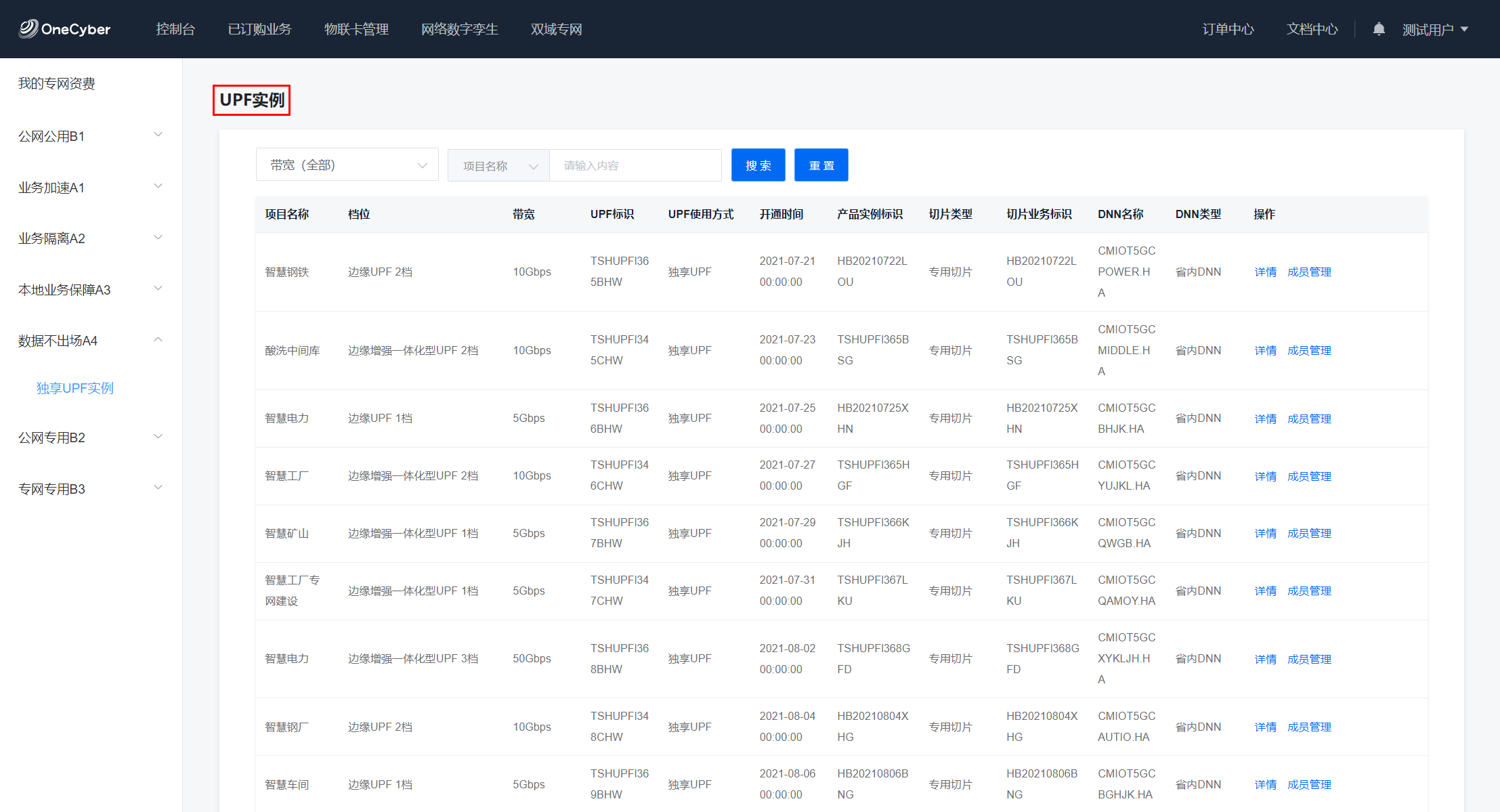 UPF实例列表页面展示客户所有已经订购成功的数据不出场产品实例,展示字段包含项目名称、档位、带宽、切片业务标识、DNN类型、DNN名称、UPF标识等数据不出场实例的基本信息。