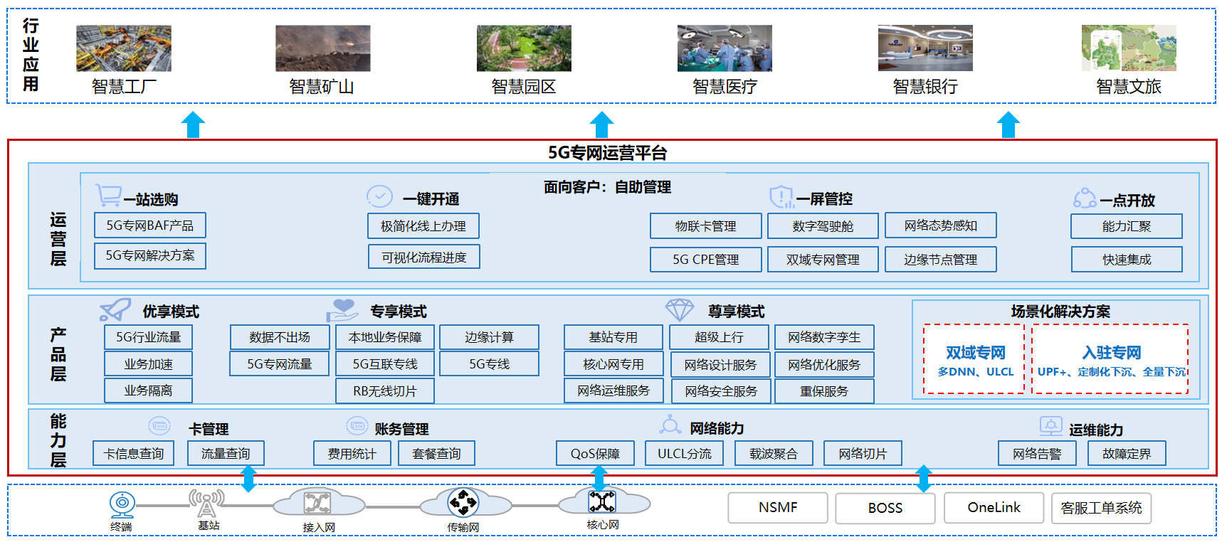 5G时代面向toB行业客户的运营门户,提供5G专网产品的线上极简化办理能力,提升专网业务开通效率;提供差异化专网服务能力,行业客户通过专网运营平台实现专网业务的可管可控,包含对网络、卡、设备、边缘节点的监控管理和数字孪生;提供深入行业的专网产品和解决方案,实现一站式订购、交付、运营的全流程服务。
