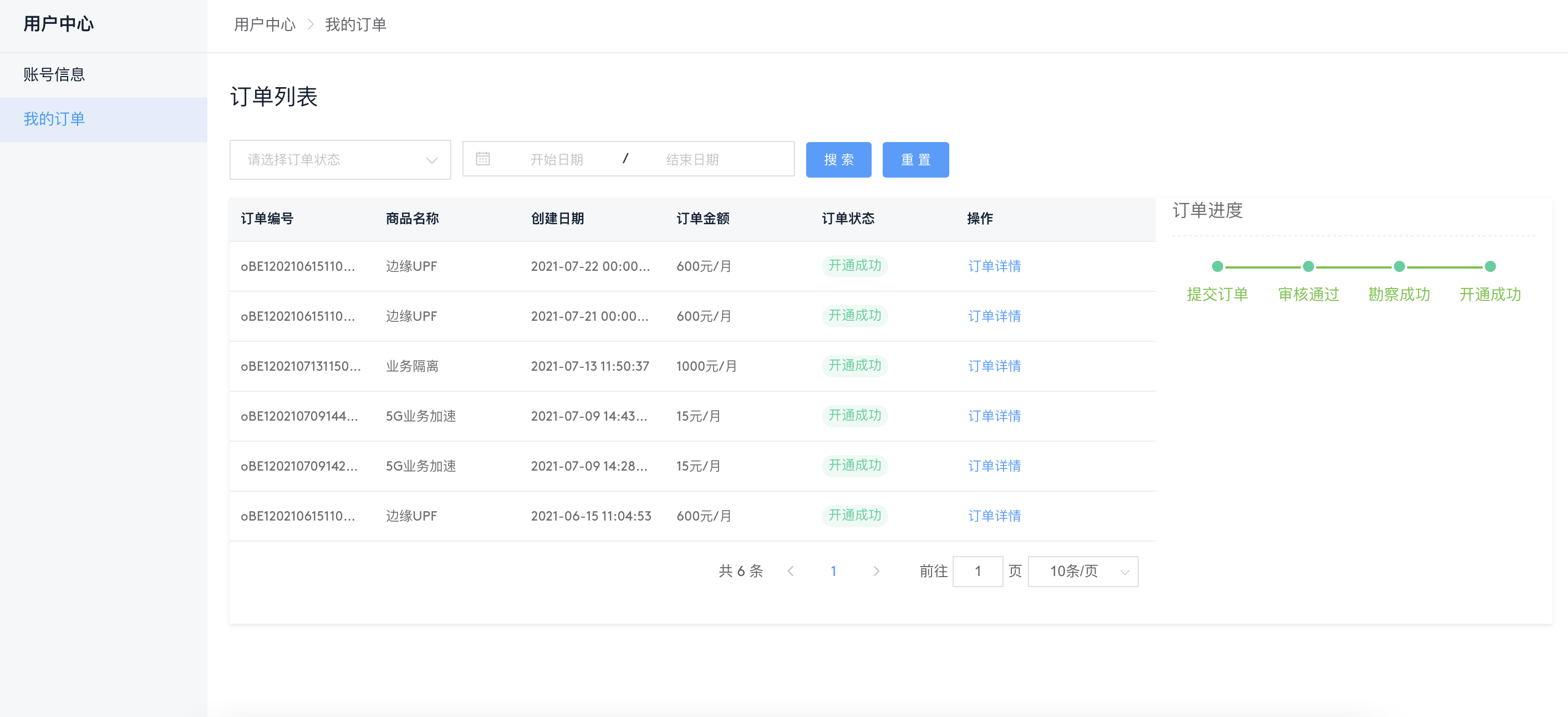 5G专网运营平台为客户提供5G专网产品的订单详情和进度查询功能。