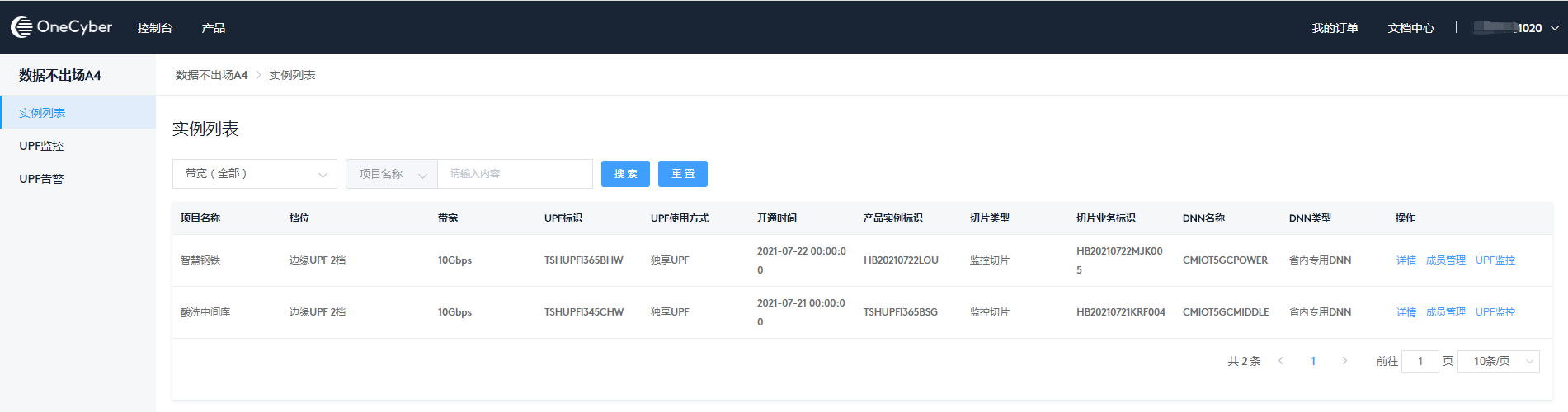 我的产品以产品为维度展示您已订购开通的专网产品,支持点击进入每个产品的控制台,查看管理产品实例和其他对应的功能。此处以数据不出场A4示例,每个产品的控制台功能详见对应的文档说明。