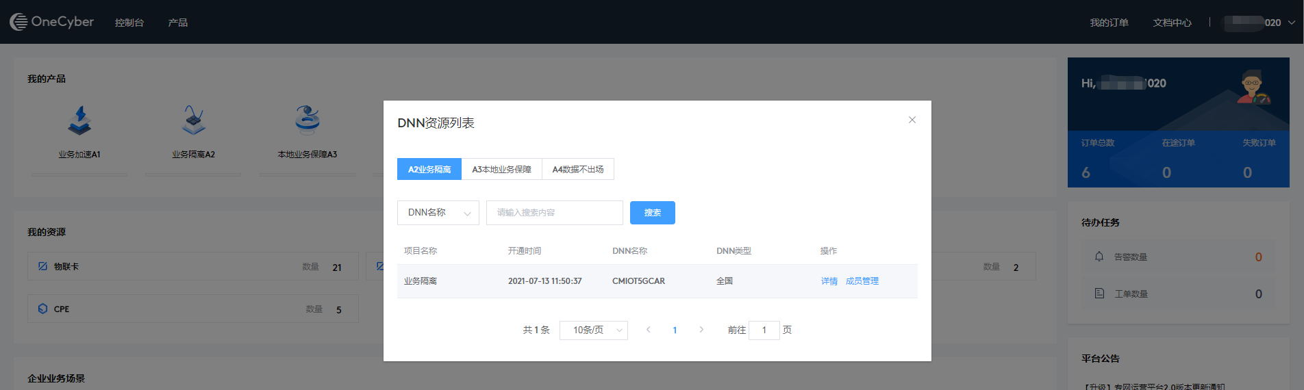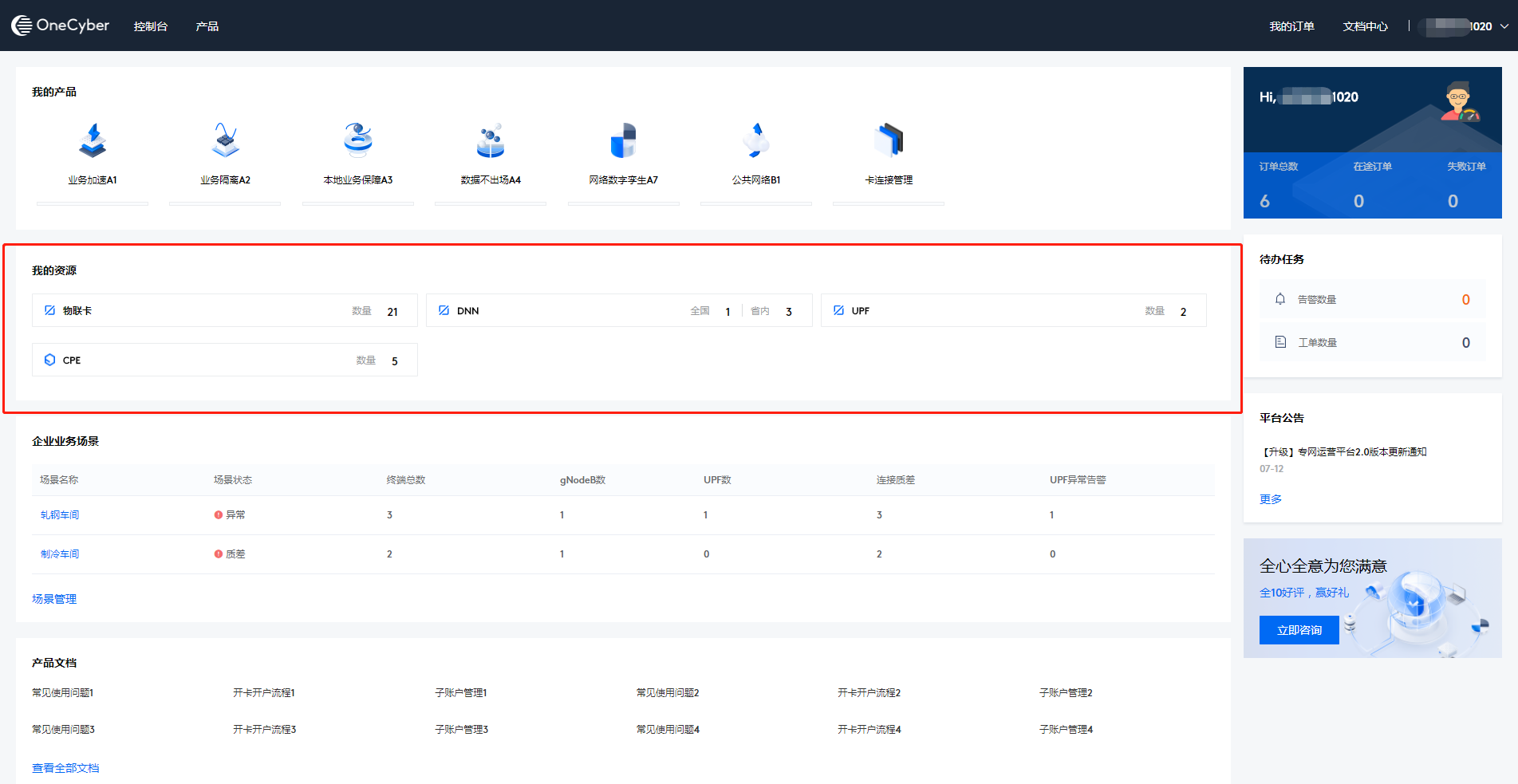 我的资源以资源为维度展示您已订购开通的资源信息,包含资源名称、资源数量等。资源包含但不限于物联卡、DNN、UPF、CPE、边缘节点、基站等。