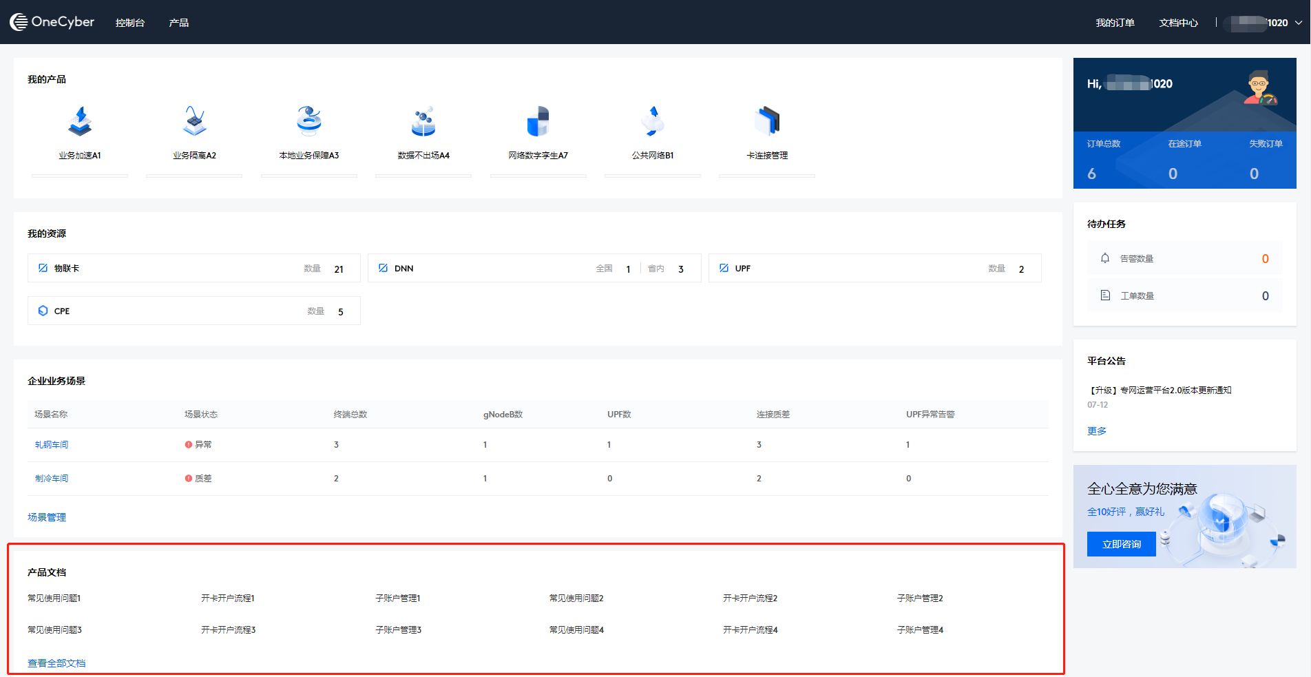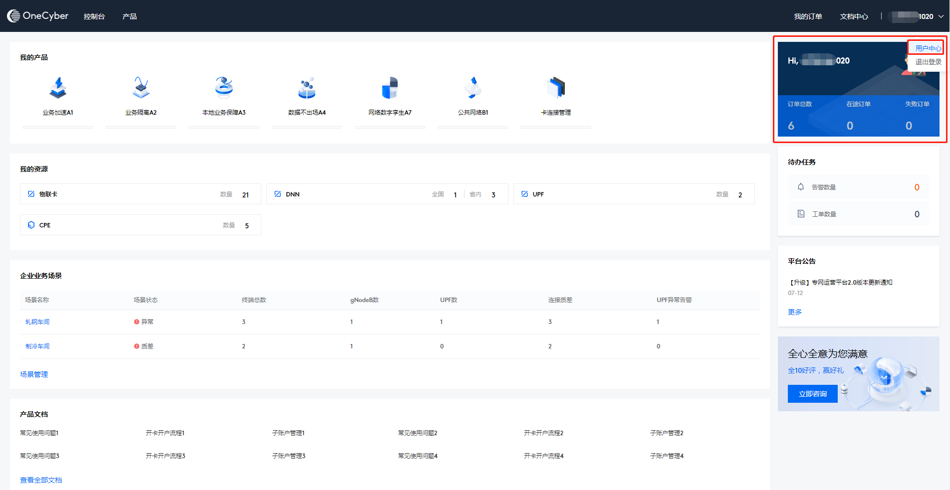 控制台提供对用户信息和已订购产品的使用管理相关功能,主要包含用户中心、产品管理、资源管理、场景管理和产品文档。