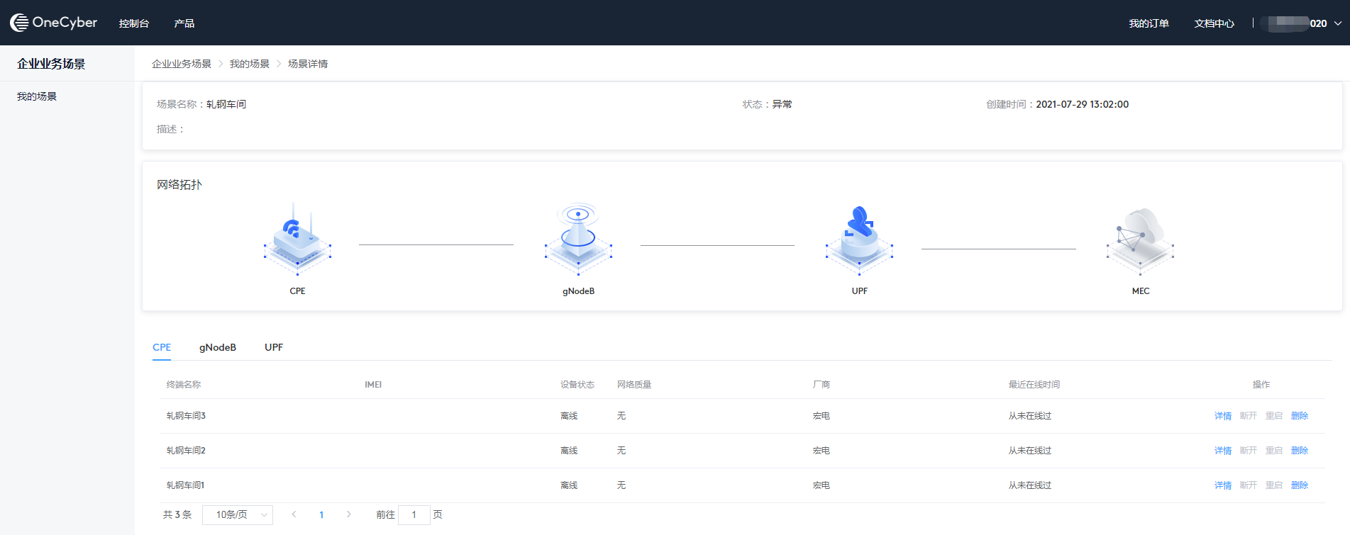 企业业务场景支持客户从实际业务场景出发将各类资源进行分组管理。以业务场景为维度展示场景名称、状态、连接终端总数、UPF数、连接质差、UPF异常告警等信息。