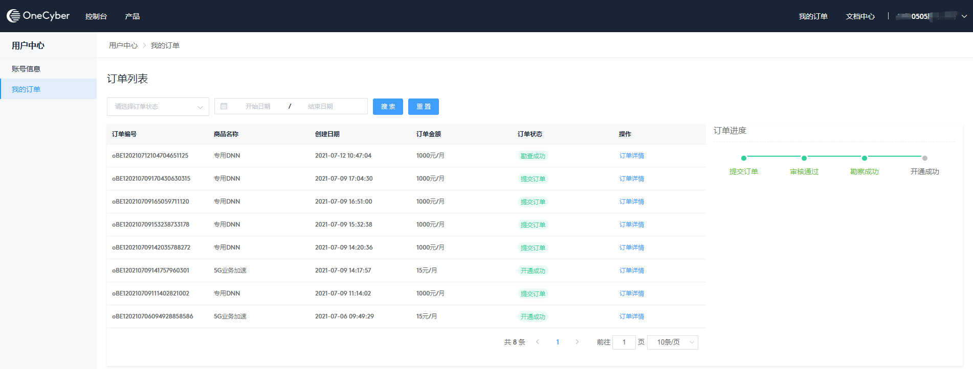 我的订单支持查看所有订单信息,包含订单编号、商品名称、订单金额、订单状态、订单进度和订单详情等信息。