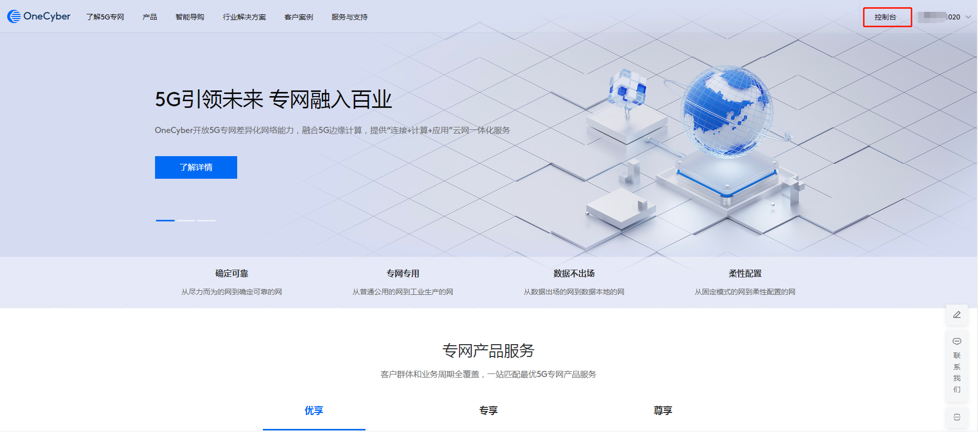 点击首页右上角“控制台”进入控制台首页。控制台需登录后才能访问,若您未登录会先跳转登录链接。