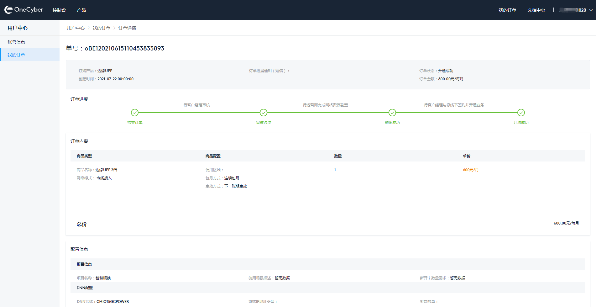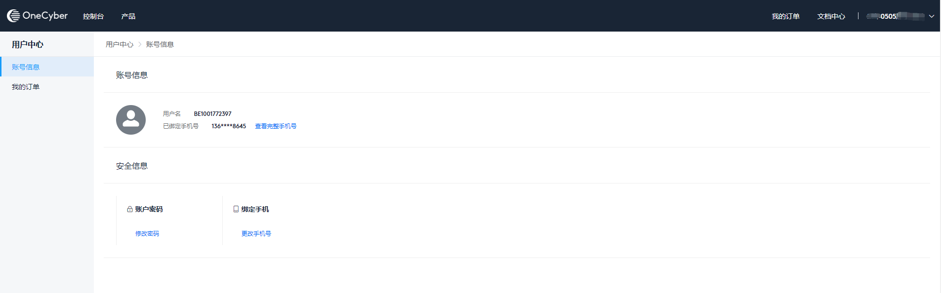 点击顶部导航账户名称或控制台首页右上角账户名称/订单统计处,进入用户中心,可查看管理账户信息和订单信息。