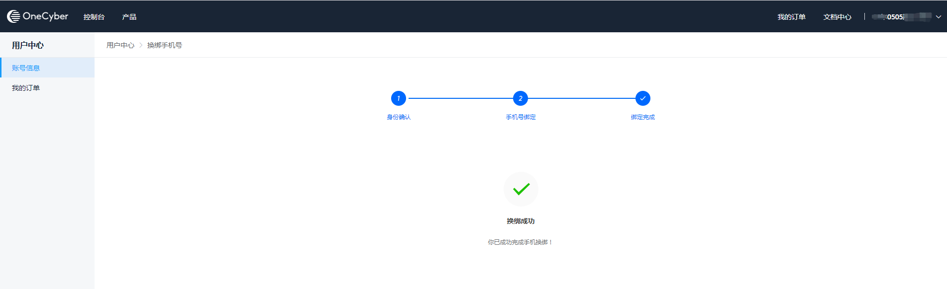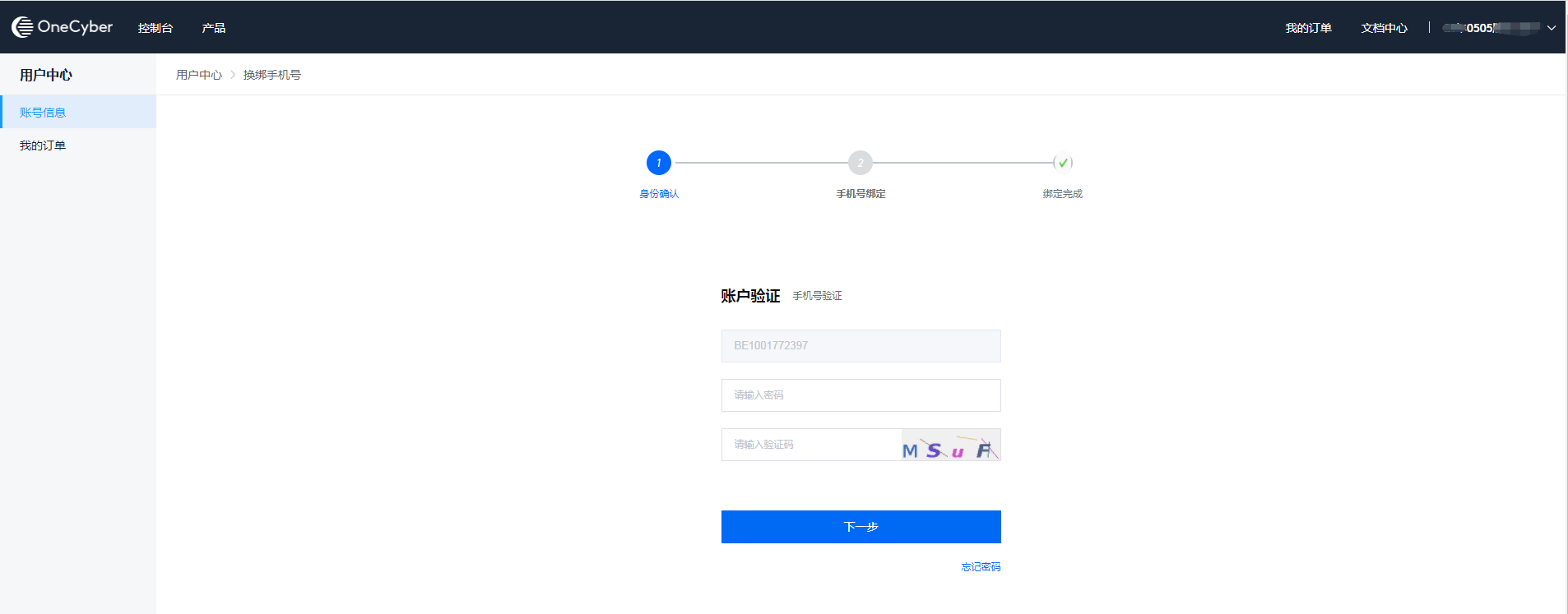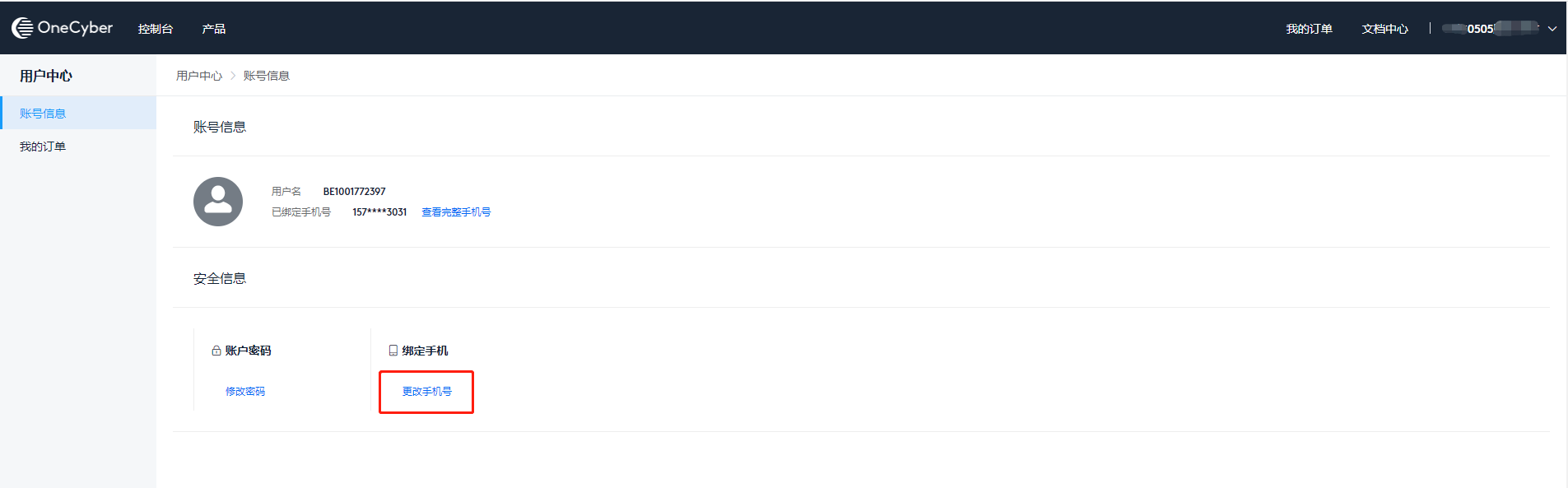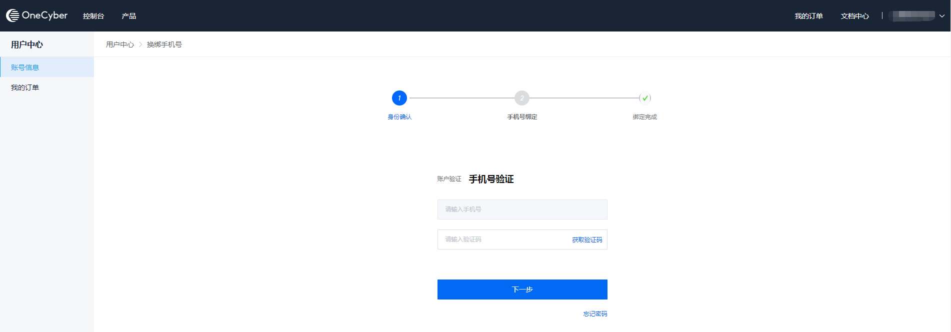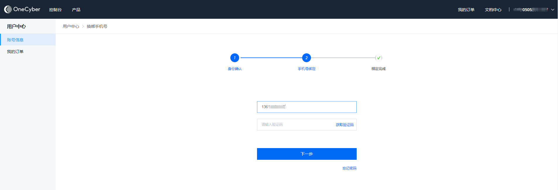 若您开户时未填写自己的手机号或者填写的是他人手机号,可以在控制台-用户中心中绑定/换绑手机,绑定/换绑成功后您就可以使用自己手机号登录OneCyber。